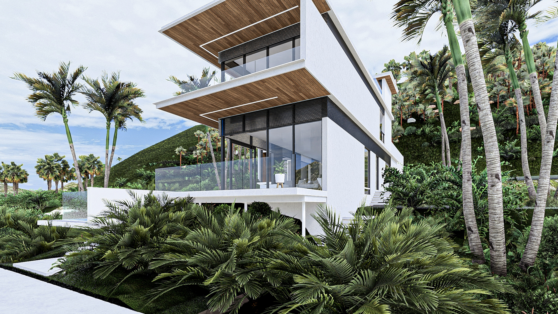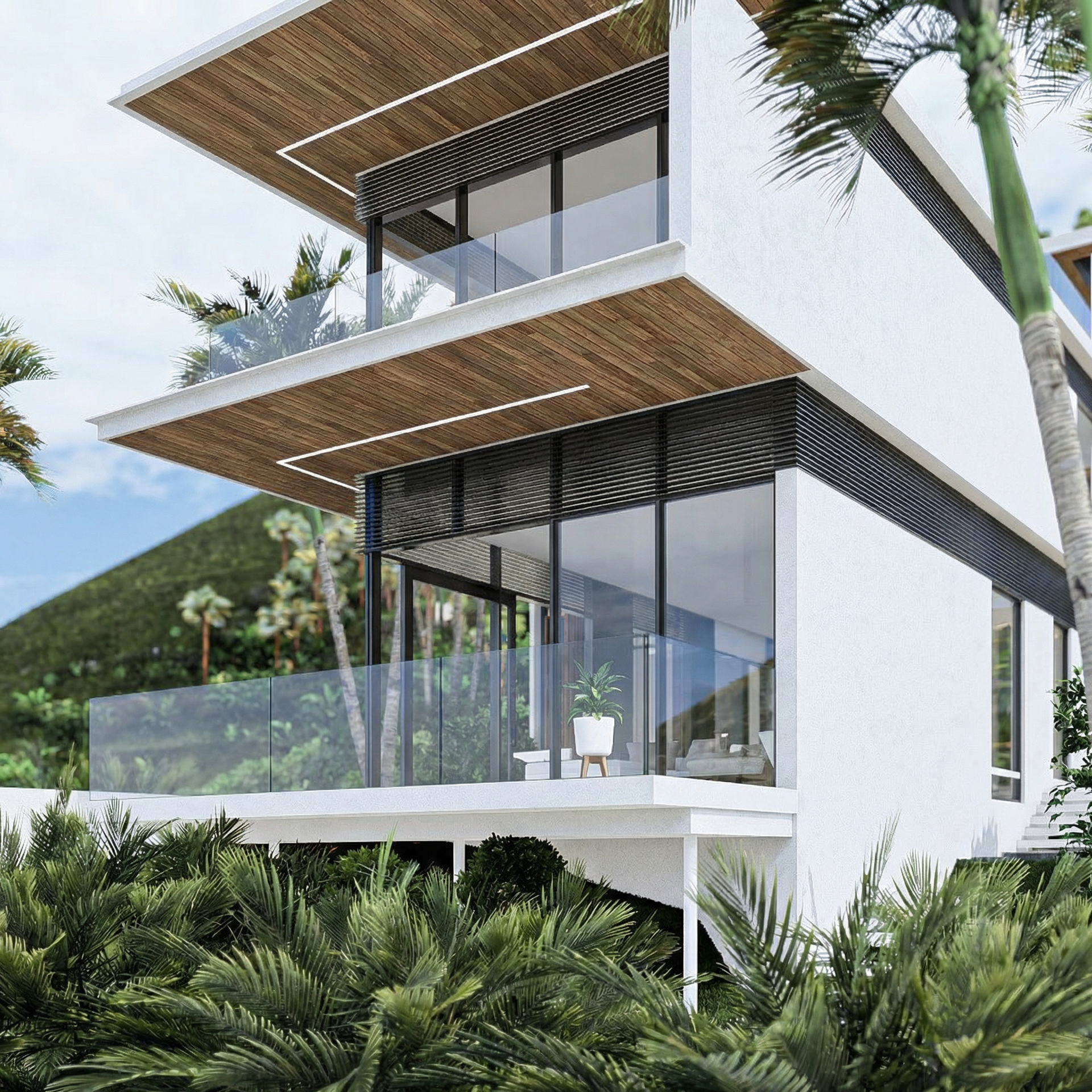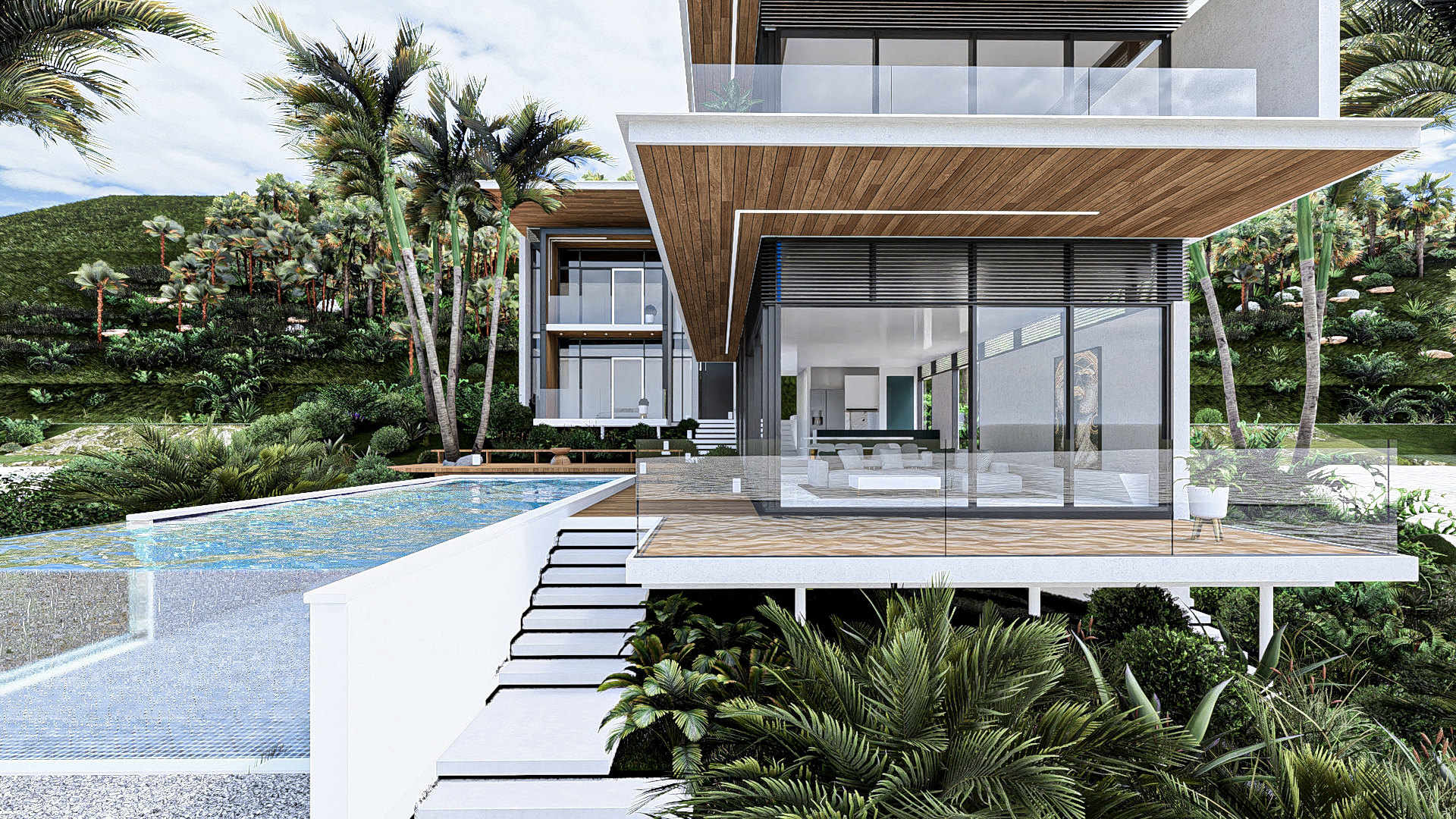 Project CB is a masterclass in modern tropical minimalism, designed to harmonize high-end luxury with the natural environment. The villa’s architecture is defined by its striking cantilevered volumes and a sophisticated material palette of warm timber, charcoal steel, and expansive glass. By prioritizing transparency, the design creates a seamless flow between the open-plan interiors and the expansive poolside terrace. Surrounded by lush palms and featuring a crisp, geometric infinity pool