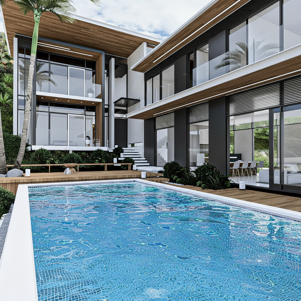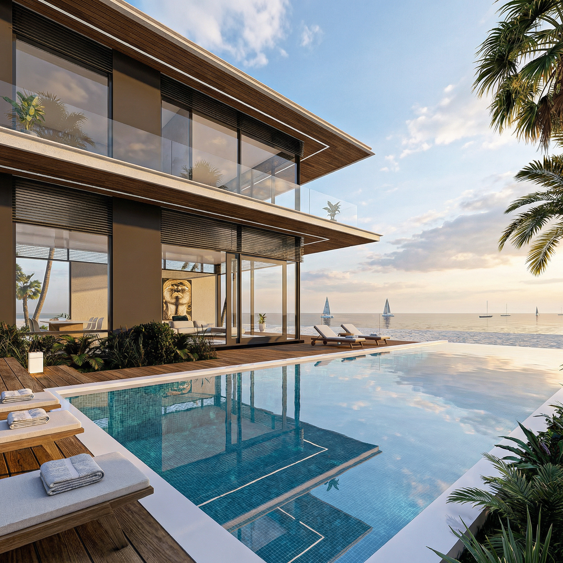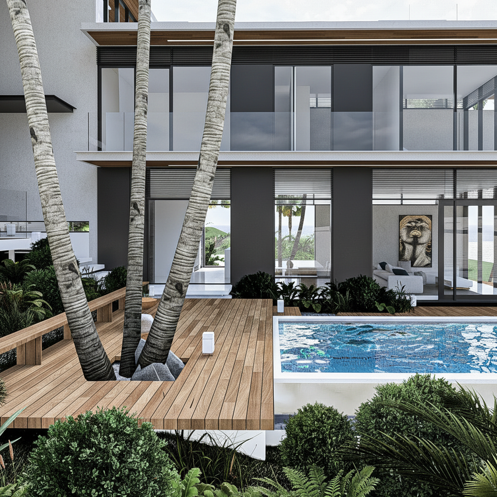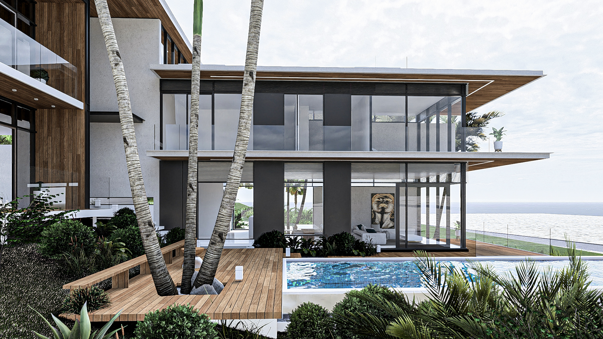 Project CB is a masterclass in modern tropical minimalism, designed to harmonize high-end luxury with the natural environment. The villa’s architecture is defined by its striking cantilevered volumes and a sophisticated material palette of warm timber, charcoal steel, and expansive glass. By prioritizing transparency, the design creates a seamless flow between the open-plan interiors and the expansive poolside terrace. Surrounded by lush palms and featuring a crisp, geometric infinity pool