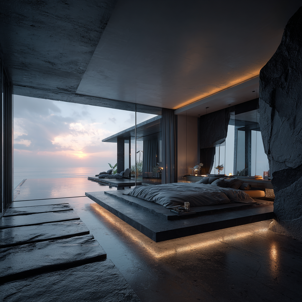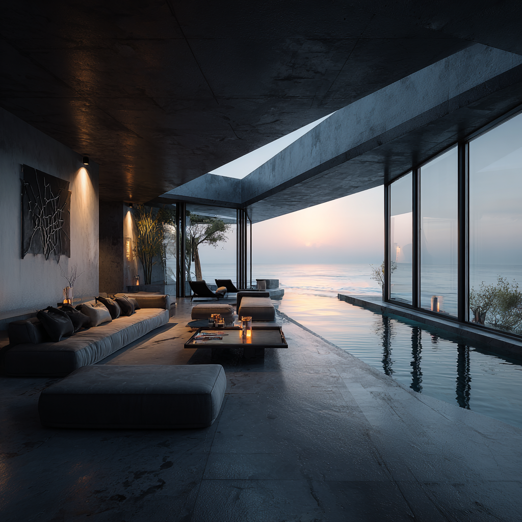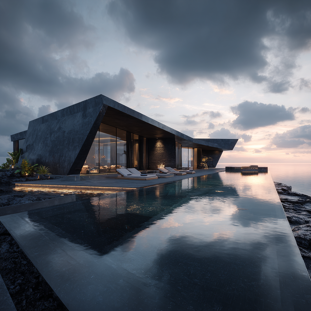 Eclipse House is a coastal sanctuary that blends brutalist geometry with natural serenity. The dark stone façade and angular lines mimic volcanic cliffs, while expansive glass walls dissolve the barrier between interior and exterior, allowing the horizon and ocean to flow into the living space. The infinity pool mirrors the shifting skies, creating the illusion of merging sea and sky. Designed as both a fortress and a retreat, it embodies contrasts raw and refined, solid and fluid, private yet infinitely open.