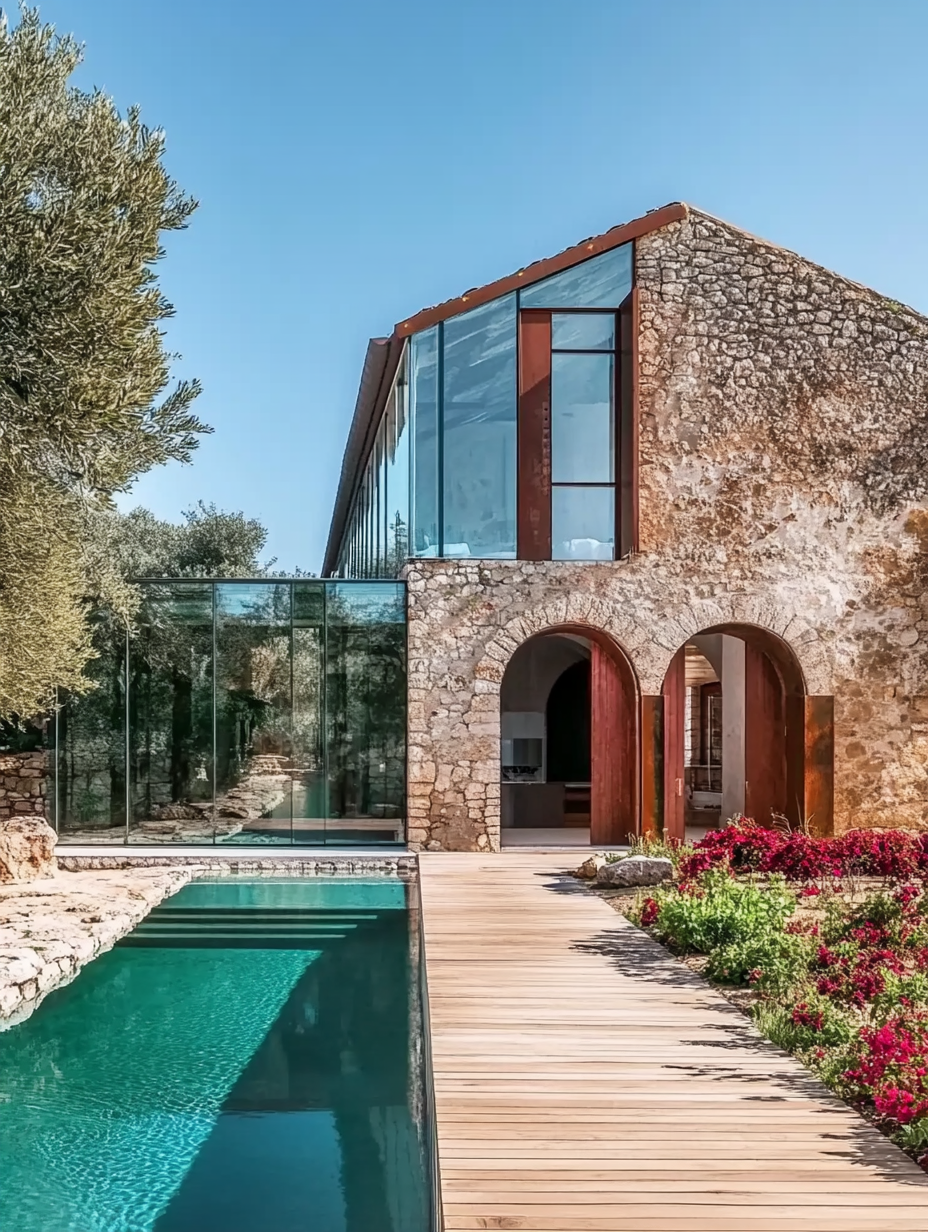 This architectural design embodies a seamless dialogue between tradition and modernity, where rustic charm meets contemporary elegance. The original stone structure, with its textured façade and arched wooden doorways, pays homage to the historical vernacular of Mediterranean rural architecture. In contrast, the sleek glass extension introduces transparency, light, and spatial openness creating a harmonious balance between permanence and fluidity. The integration of natural materials like wood and stone with clean modern lines fosters a connection between the built environment and its natural surroundings. Framed by lush landscaping and a tranquil pool, the design promotes indoor-outdoor living, reflecting a lifestyle that values serenity, heritage, and modern comfort