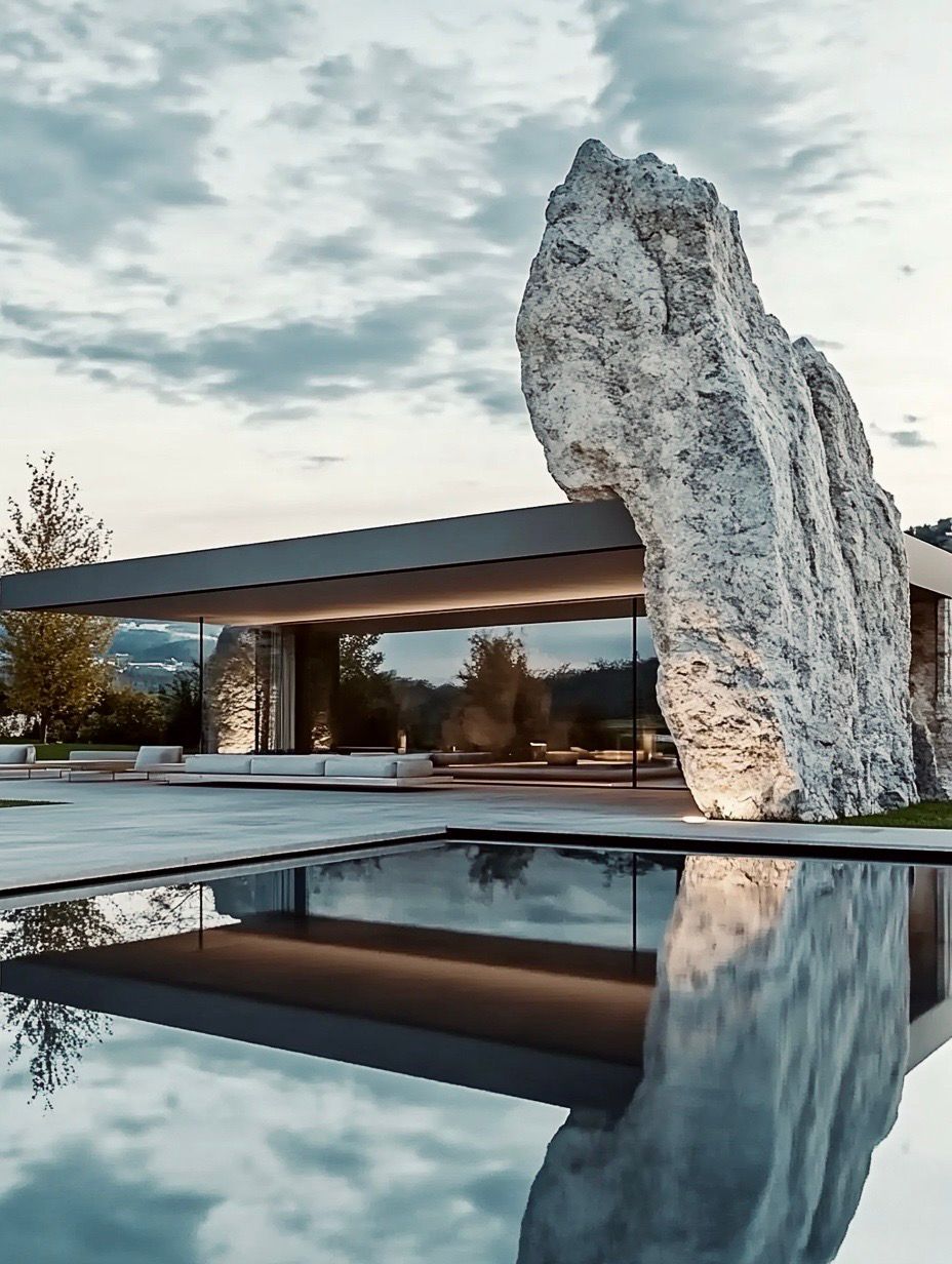 "Monolith House" is a striking example of context-sensitive architecture that harmoniously fuses raw nature with refined minimalism. Anchored by a monumental rock formation that boldly intersects the clean lines of a modern glass pavilion, the design creates a powerful dialogue between permanence and lightness, nature and human intervention. The use of transparent materials and reflective surfaces enhances the connection to the landscape, allowing the architecture to disappear into its surroundings while celebrating the site's natural identity. This bold yet respectful gesture transforms the rock from obstacle to centerpiece, embodying a poetic balance between the organic and the man-made.