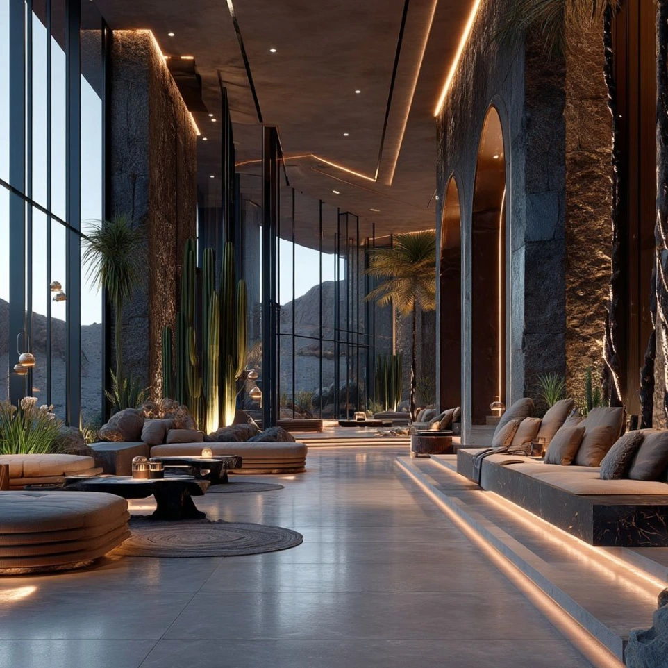 A luxury desert sanctuary where modern architecture merges seamlessly with raw natural rock formations. The design celebrates contrasts: rugged stone walls paired with sleek glass facades, expansive infinity pools mirroring the desert skies, and warm, intimate interiors illuminated against the stark desert landscape. Guests experience serenity, exclusivity, and connection with nature a hidden oasis where the desert’s silence becomes the essence of luxury.