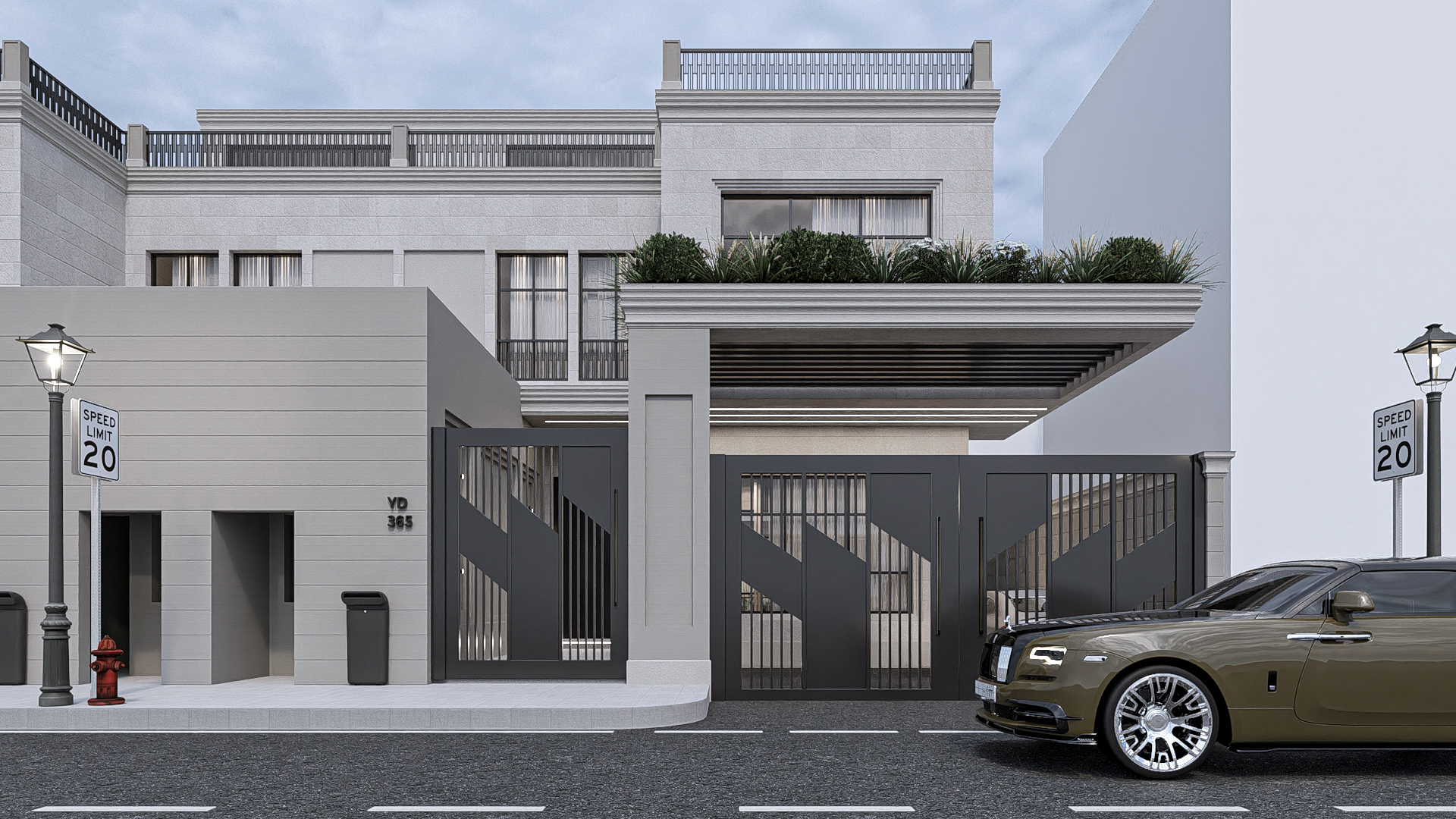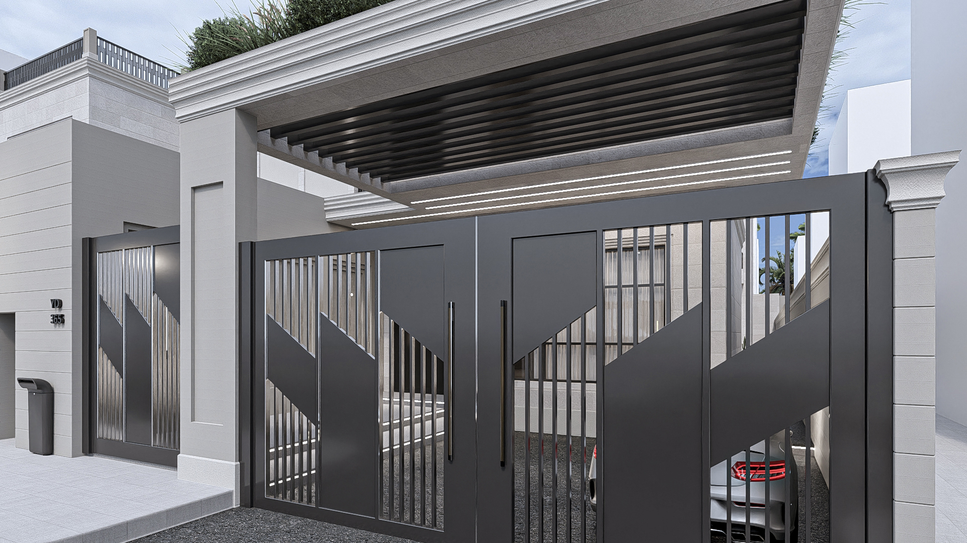 Structural Design: The building features a multi-tiered, cantilevered structure. The use of deep overhanging eaves with wood-paneled undersides provides essential shading while adding a warm, organic texture to the sleek design.